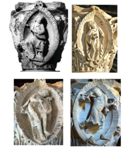 Una de las fuentes históricas más antiguas del octoechos con sus ocho ethos son los capiteles de la iglesia de la abadía de Cluny, en Francia, que podrían ser anteriores al año 1000. Sobre cada columna, en el seno del capitel, se aprecia esculpida una imagen distinta: en el primero, un músico afinando su laúd; en el segundo, una mujer danzando; en el tercero, un hombre con barba tocando el salterio; y, finalmente, en el cuarto, un personaje peculiar que lleva un yugo en el cuello del cual penden tres campanas, y lleva en la mano una cuarta campana. Si bien actualmente los capiteles se encuentran algo deteriorados, alrededor de cada figura humana se leen bien las inscripciones propias. Alrededor del afinador del laúd está escrito: Hic tonus orditur modulamina música primus, Este primer tono comienza las armonías musicales, y Subsequitur ptongus numero vel lege secundus, Le sigue según número o ley el segundo. La mujer que danza está adornada con las palabras Tertius impingit Christumque resurgere fingit, El tercero se impone y representa que Cristo ha resucitado, y Succedit quartus simulans in carmine planctus, Le sucede el cuarto que en su canto imita los lamentos. El barbudo con el salterio parece dar estos consejos: Ostendit quintus quam sit quisquis tumet imus, El quinto muestra cómo baja quien se eleva, y Si cupis affectum pietatis, respice sextum, Si buscas el afecto de la piedad, mira al sexto. El último capitel con su misterioso siervo de las campanas reza: Insinuat flatum cum donis septimus almum, El séptimo recuerda al Espíritu con sus dones, y Octavus santos omnes docet esse beatos, El octavo enseña que todos los santos son beatos.