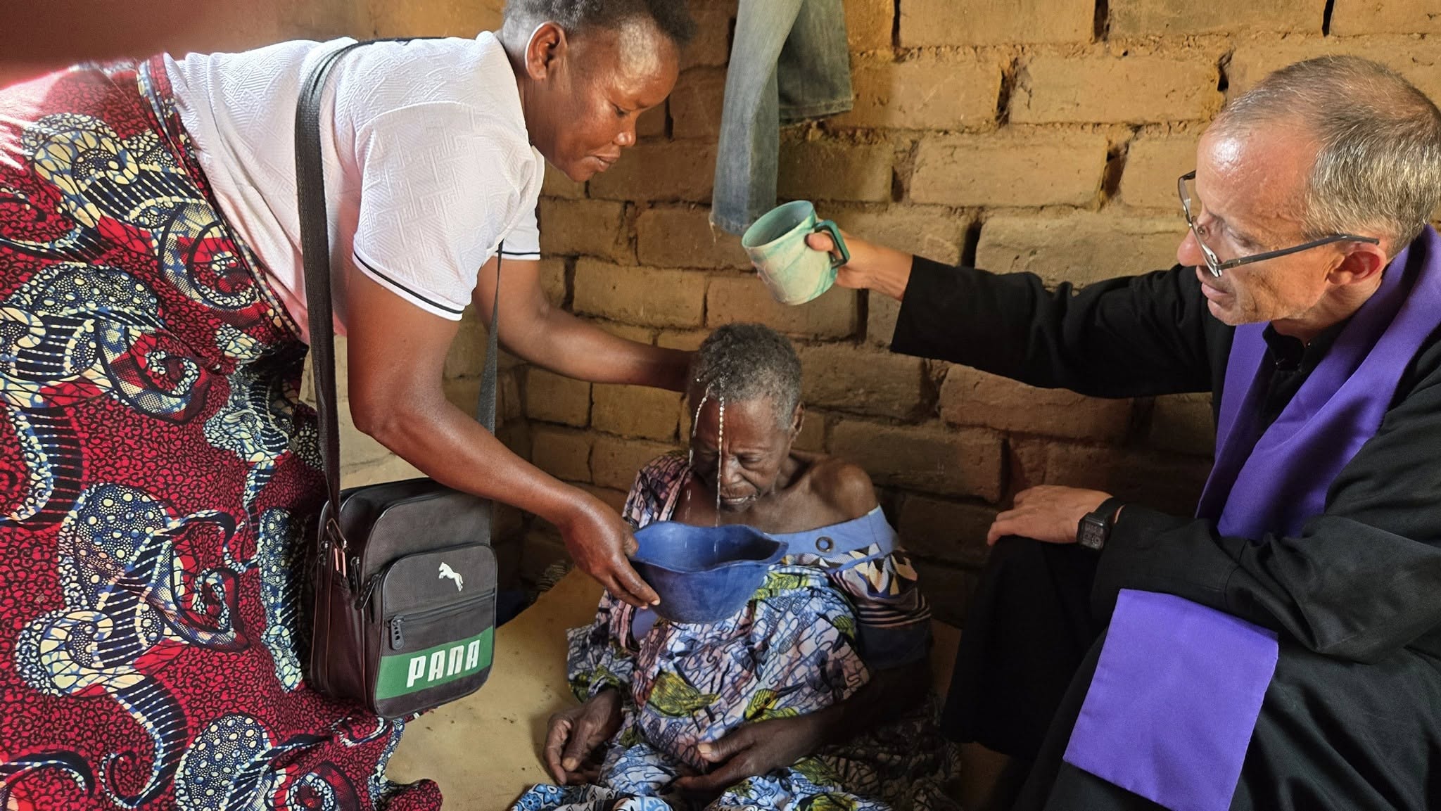 El segundo caso es también muy impresionante. Nos despedimos de esta primera casa, y fuimos muy cerquita a otra casa donde nos esperaban para bautizar a otra señora, a quien se la veía mucho más mayor que la anterior, y con su salud muy endeble. La casita donde estaba era de una de sus nietas, según lo que pude entender. Una casita muy humilde, apenas tres ambientes de tres por tres metros cada uno. Piso de tierra y muros de ladrillos cocidos, y pegados con barro. El techo de chapa, no muy elevado, de tal forma que se lo puede tocar con la mano. En el ambiente del medio, que hace de entrada a la casa, la sentaron en el piso, apoyada contra la pared, y allí entramos todos: dos catequistas, cuatro mujeres de la familia, y el sacerdote. Es admirable cómo se sientan en cuclillas, y en un espacio muy pequeño todos pueden estar bien sentados.