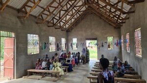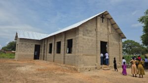 Llegué desupués de haber celebrado la misa en la iglesia parroquial de Kangeme, y luego una segunda misa en la aldea de Namba 11. En aquél terreno que bendijimos en el año 2018, estaba la iglesia que yo veía por primera vez, y un gran grupo de gente. Se trataba de feligreses de Ihata, pero también de otros que habían venido para esta fiesta, pues bendeciríamos la nueva construcción, y habían invitado a las capillas vecinas. Los niños de la escuela primaria habían pedido permiso, y vinieron con el catequista que también es maestro de la escuela. Los jóvenes católicos del colegio secundario también vinieron, y eran más de cien, por lo que podía calcular. Estos jóvenes dirigieron los cantos de la misa. Fue una inmensa alegría para mí estar celebrando en ése lugar, como se imaginarán, después de conocer su larga historia… y de pensar que en trece años sólo se había celebrado la misa una sola vez. Alegría de poder tener nuevamente la esperanza de que sigan adelante, esta vez sí, sin volver atrás. Hay que rezar por ellos.