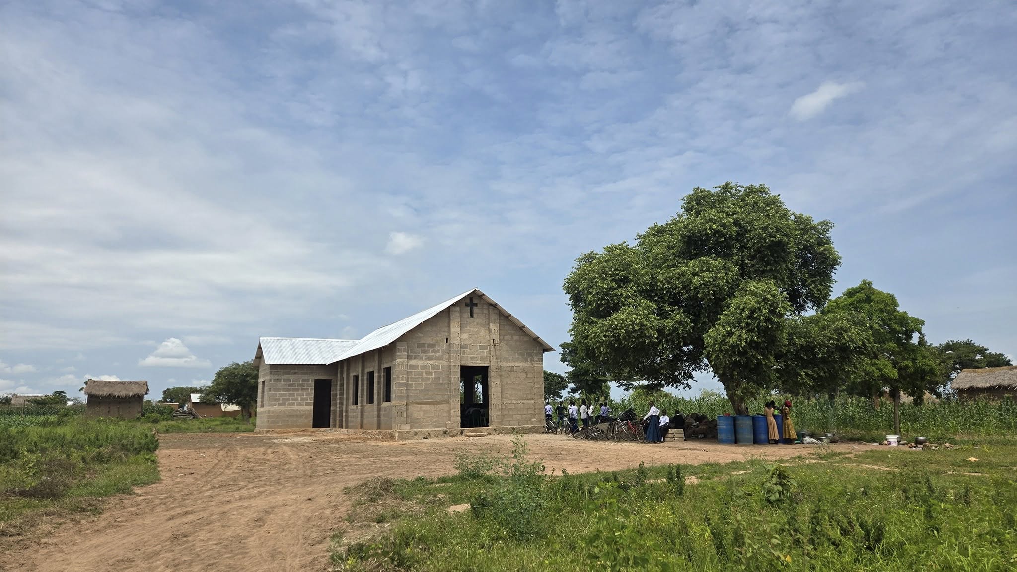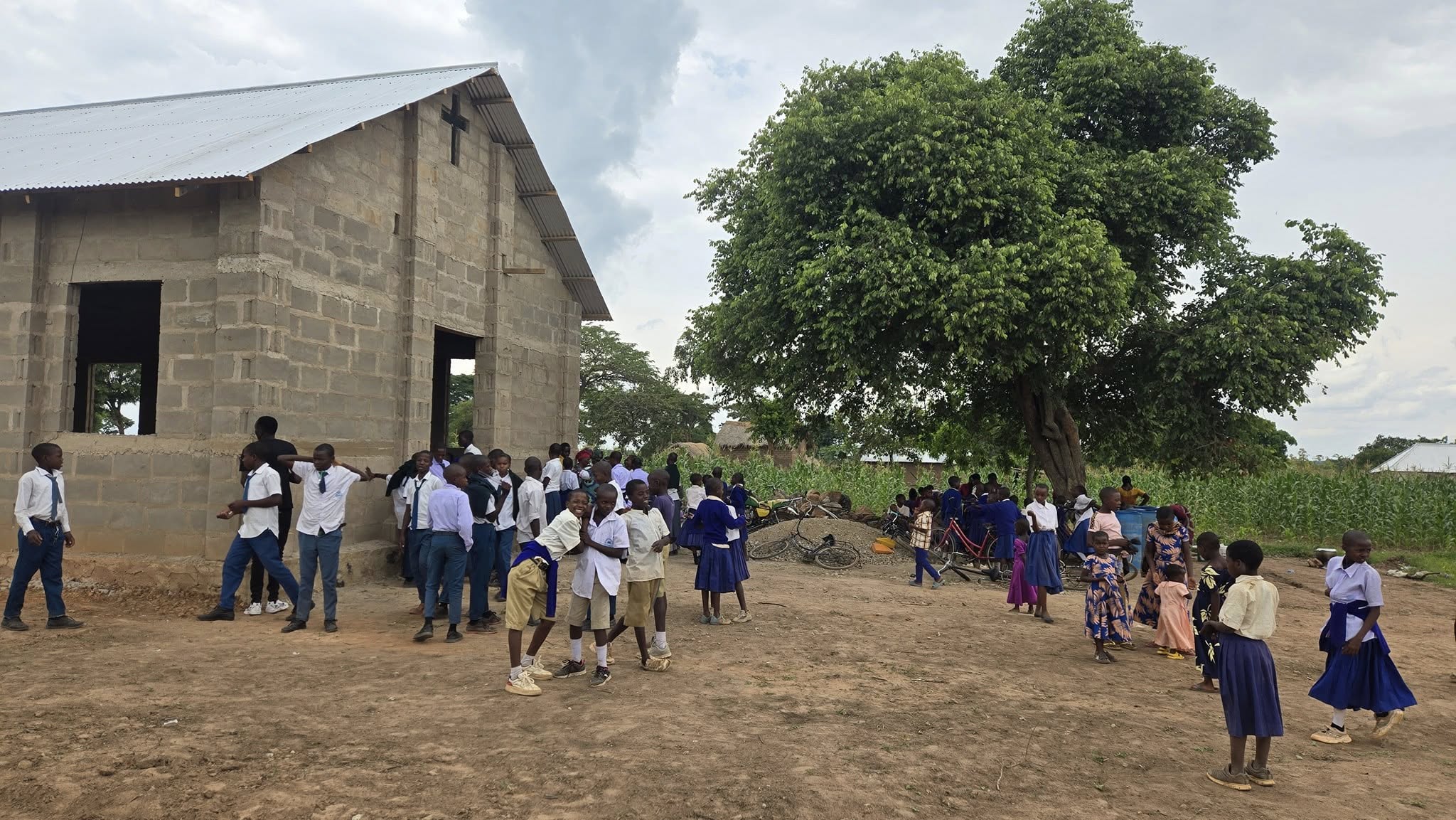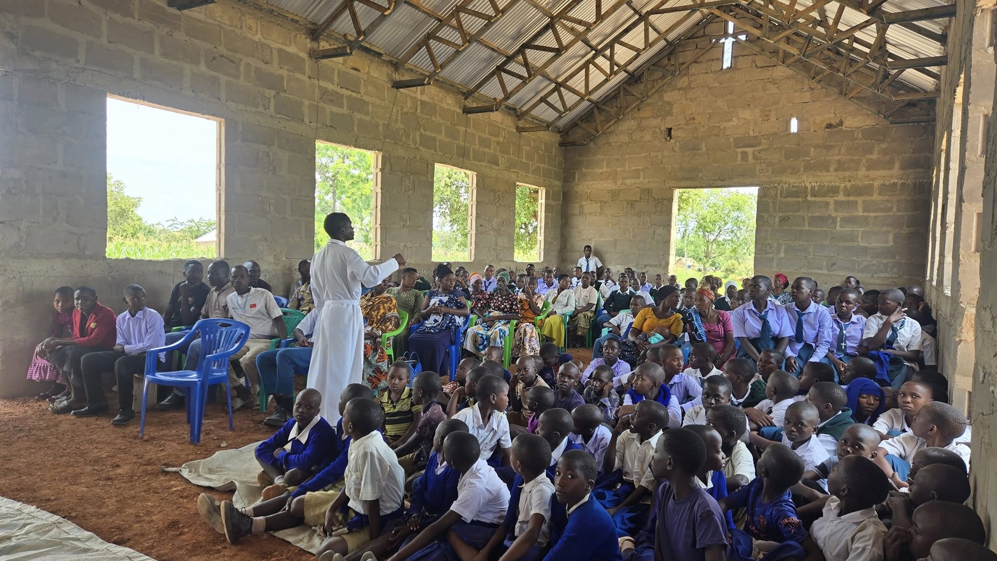 Llegué desupués de haber celebrado la misa en la iglesia parroquial de Kangeme, y luego una segunda misa en la aldea de Namba 11. En aquél terreno que bendijimos en el año 2018, estaba la iglesia que yo veía por primera vez, y un gran grupo de gente. Se trataba de feligreses de Ihata, pero también de otros que habían venido para esta fiesta, pues bendeciríamos la nueva construcción, y habían invitado a las capillas vecinas. Los niños de la escuela primaria habían pedido permiso, y vinieron con el catequista que también es maestro de la escuela. Los jóvenes católicos del colegio secundario también vinieron, y eran más de cien, por lo que podía calcular. Estos jóvenes dirigieron los cantos de la misa. Fue una inmensa alegría para mí estar celebrando en ése lugar, como se imaginarán, después de conocer su larga historia… y de pensar que en trece años sólo se había celebrado la misa una sola vez. Alegría de poder tener nuevamente la esperanza de que sigan adelante, esta vez sí, sin volver atrás. Hay que rezar por ellos.