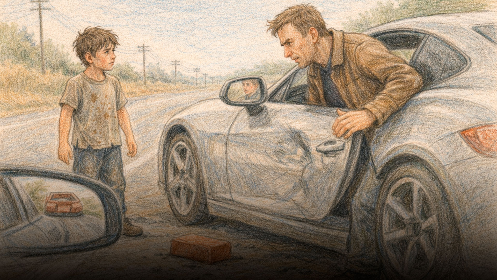 Ese coche resultó ser un lujoso deportivo. Aun así, el niño no dudó y lanzó el ladrillo. Al oír el impacto, el propietario del coche miró por el retrovisor y vio al niño y el ladrillo tirado en medio de la carretera. Detuvo el coche y salió para comprobar el evidente daño: el niño había lanzado el ladrillo y abollado su coche.