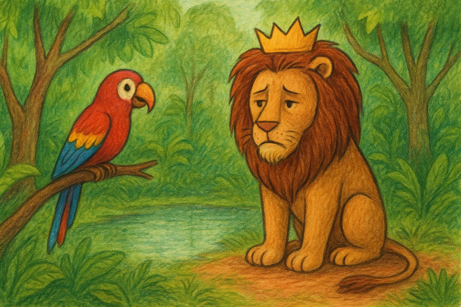 Un día, un loro vio que se entristecía al ver su reflejo en el lago y le preguntó por qué estaba triste. El león respondió: «Porque no me gusta mi imagen reflejada en el lago». Entonces el loro le dijo: «El problema no es tu imagen, sino la selva que te rodea. Tienes que hacer que los animales transformen esta selva en la mejor selva, y entonces serás el mejor rey porque gobernarás la mejor selva, y así tu imagen cambiará».