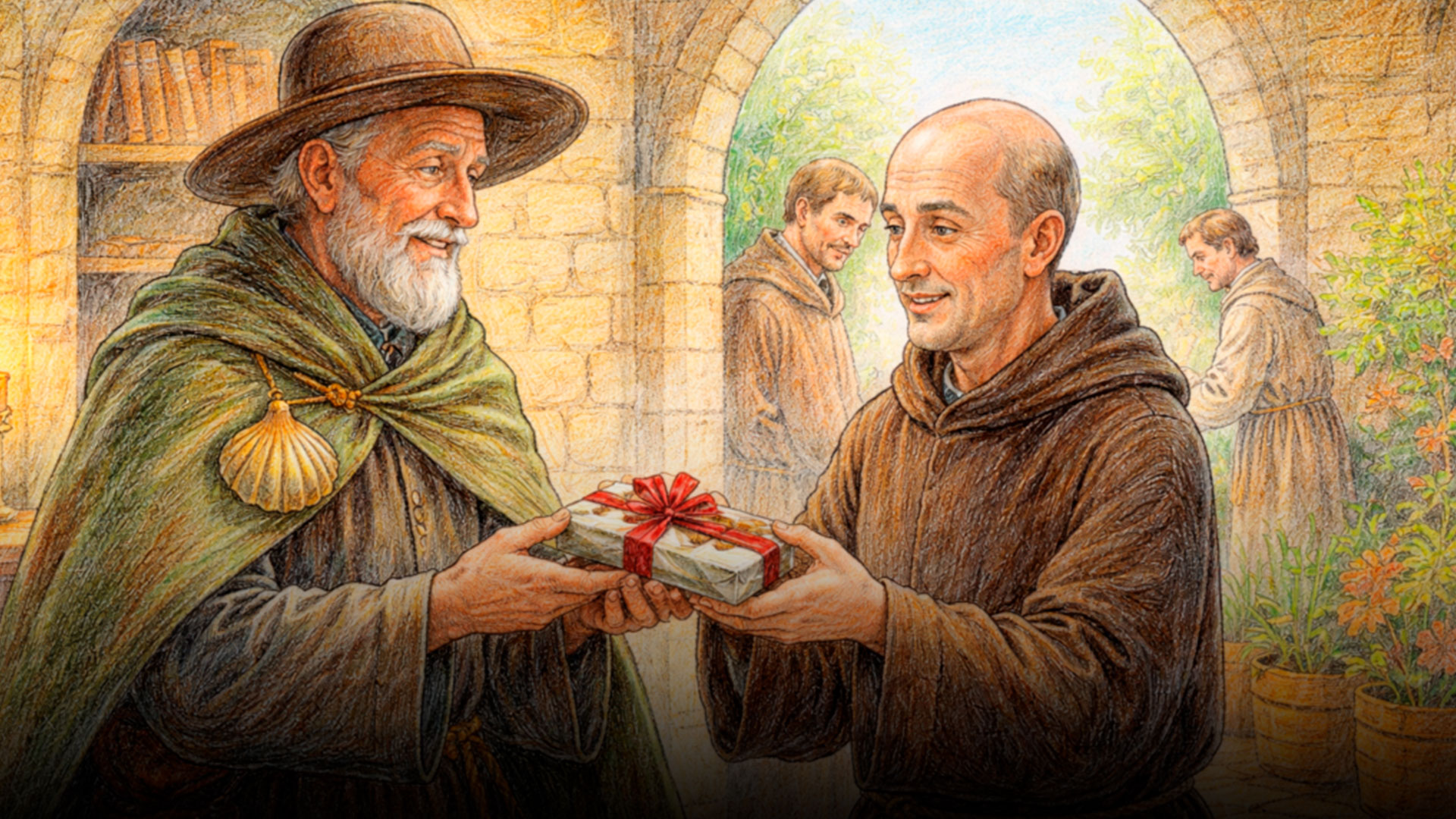 Cuando el hermano enfermero recibió el chocolate, se alegró mucho, pero luego pensó: «Sería mejor dárselo al hermano jardinero, que trabaja duro todos los días para que tengamos comida en nuestros platos». Así que le llevó el chocolate al hermano jardinero. El chocolate pasó de un hermano a otro hasta que finalmente volvió a las manos del monje anfitrión.