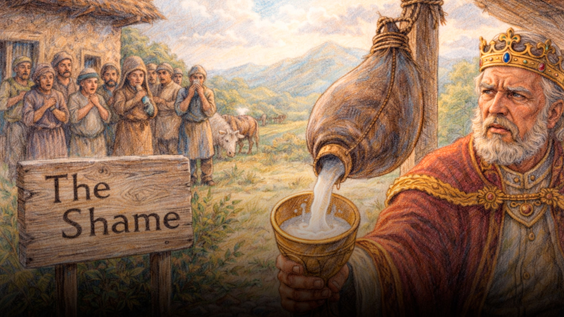 Al día siguiente, dejaron el odre de vino frente a la residencia del rey. Este, que había traído sus propias provisiones, decidió aceptar la ofrenda de los aldeanos y optó por desayunar la leche que le habían ofrecido. Sin embargo, cuando el rey y su séquito la bebieron, vieron que no era leche, sino un líquido blanquecino con aspecto de leche, pero que sabía a nada más que una falta de respeto, y la situación era una auténtica vergüenza.